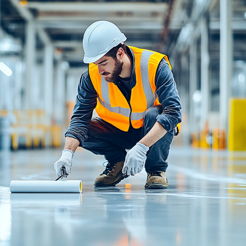 L’intervention se déroule dans un environnement de chantier classique. Un opérateur applique une peinture époxy destinée au marquage de zones de circulation. Ce type de tâche est fréquent et ne présente pas de difficulté particulière. Avec le temps, ce caractère routinier peut réduire la perception du danger.